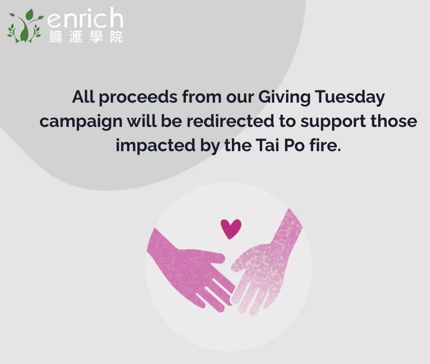 All proceeds from our Giving Tuesday campaign will be redirected to support those impacted by the Tai Po fire.